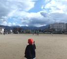 1年生が先週作った凧あげに挑戦しました。今日はちょうどいい風が吹いていて、みんな上手に凧をあげることができて、大喜びでした。